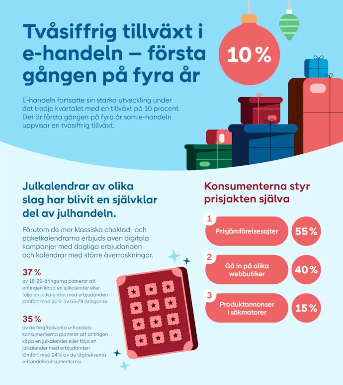 För första gången på fyra år visar svensk e-handel tvåsiffrig tillväxt. Det visar PostNords E-barometer. Under tredje kvartalet ökade tillväxten med 10 procent jämfört med samma kvartal förra året. Den stärkta framtidstron hos hushållen syns nu direkt i köpmönstren. Det ger e-handeln en flygande start inför årets mest intensiva period.